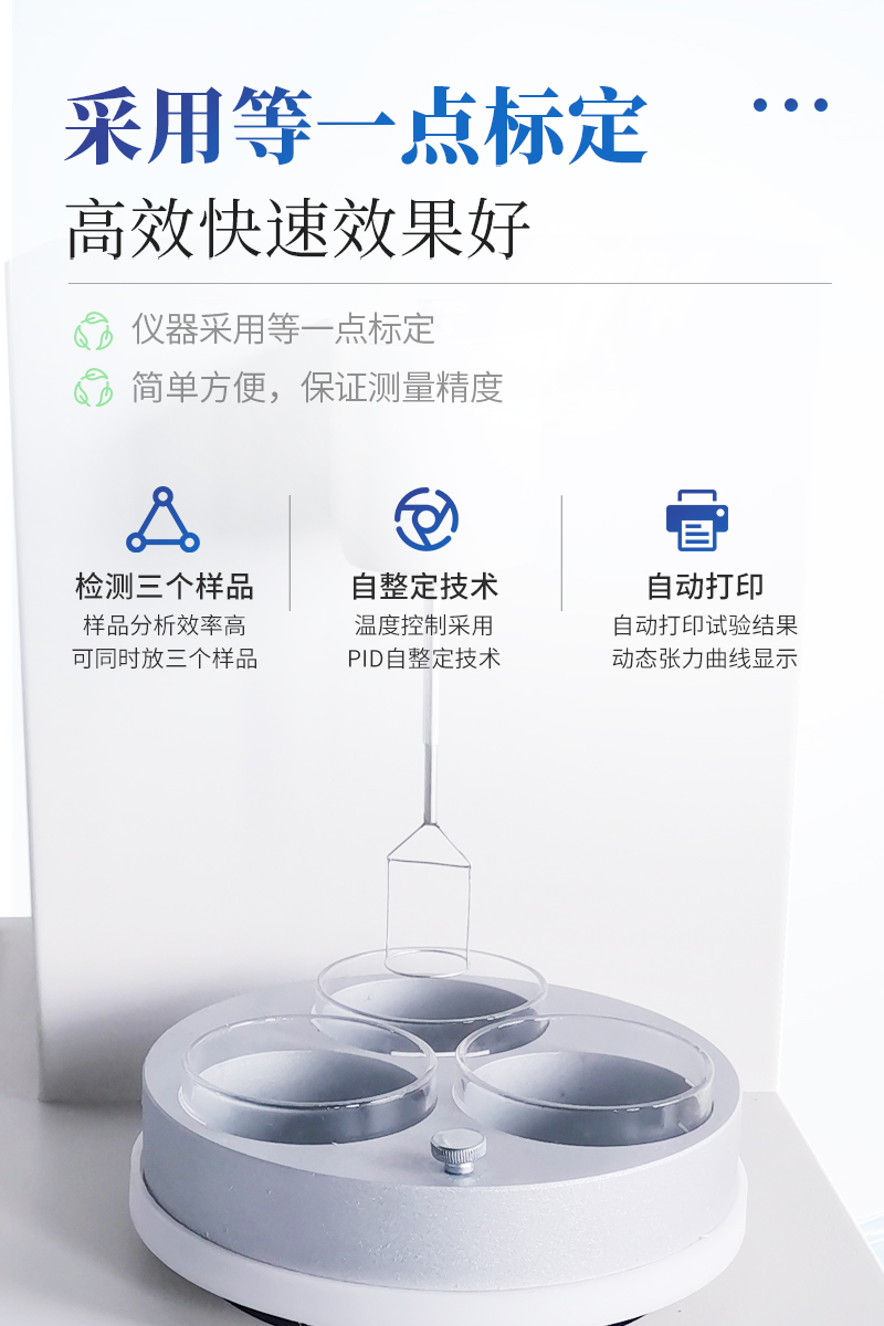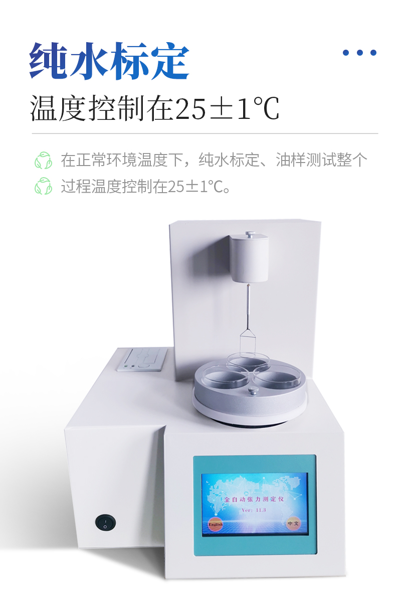 儀器特點(diǎn)★ 在正常環(huán)境溫度下,純水標(biāo)定、油樣測(cè)試整個(gè)過程溫度控制在25±1℃。★ 溫度控制采用PID自整定技術(shù)★ 樣品分析效率高,可同時(shí)放三個(gè)樣品★ 使用不同測(cè)量環(huán)儀器自動(dòng)修正參數(shù)★ 自動(dòng)打印試驗(yàn)結(jié)果,動(dòng)態(tài)張力曲線顯示★儀器采用等一點(diǎn)標(biāo)定,簡單方便,保證測(cè)量精度;★高清晰彩色觸摸